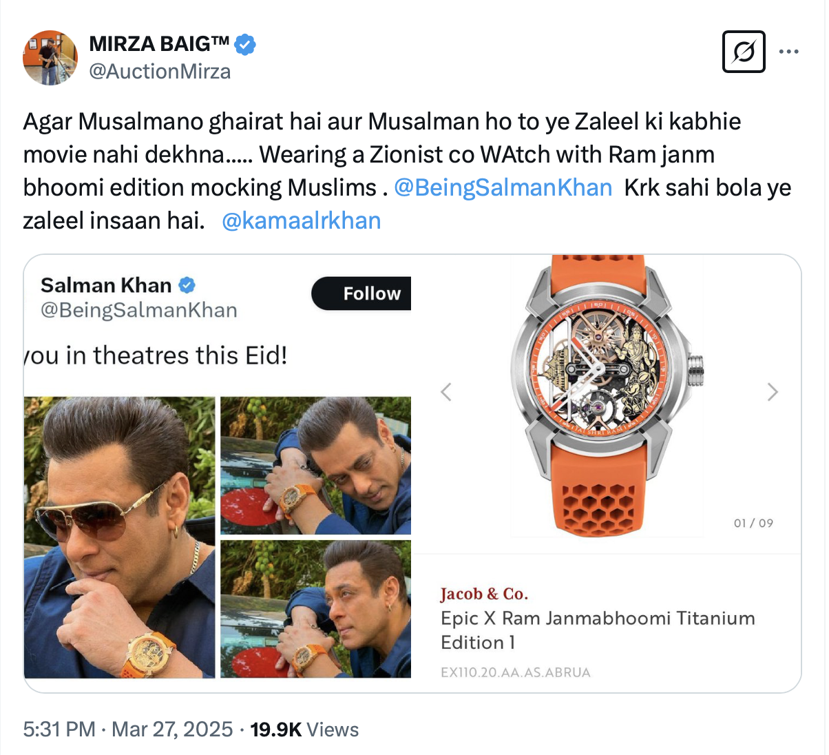 But no sooner did Salman share his pictures on X, a raft of Islamists descended on his Timeline, abusing and attacking him for sporting a Ram Janmabhoomi Titanium edition watch manufactured by Jacob and Company, the luxury jewelry and watch brand founded by Jacob Arabo, a Bukharian Jewish man who is often targeted by Islamists for his staunch support to Israel.
