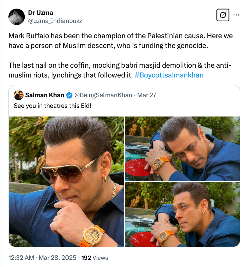 Another Islamist has called for a boycott of Salman Khan’s upcoming movie Sikandar, accusing the actor of “mocking the Babri demolition” and “anti-Muslim riots.” Ironically, the same individual, a vocal supporter of the Palestinian cause, failed to explain why the Ram Janmabhoomi movement—a reclamation effort similar to the one she endorses for Palestine—is unjust while the Palestinian struggle is legitimate.