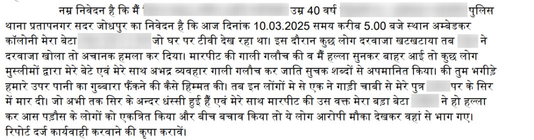 When she came out after hearing the commotion, they abused her and the young boy. The accused also hurled casteist slurs against the family. They asked how he dared to throw a water balloon at them. A vehicle key was then used by one of attackers to stab the minor in the head and it is still stuck there. She was also thrashed by the perpetrators. OpIndia has a copy of the FIR.