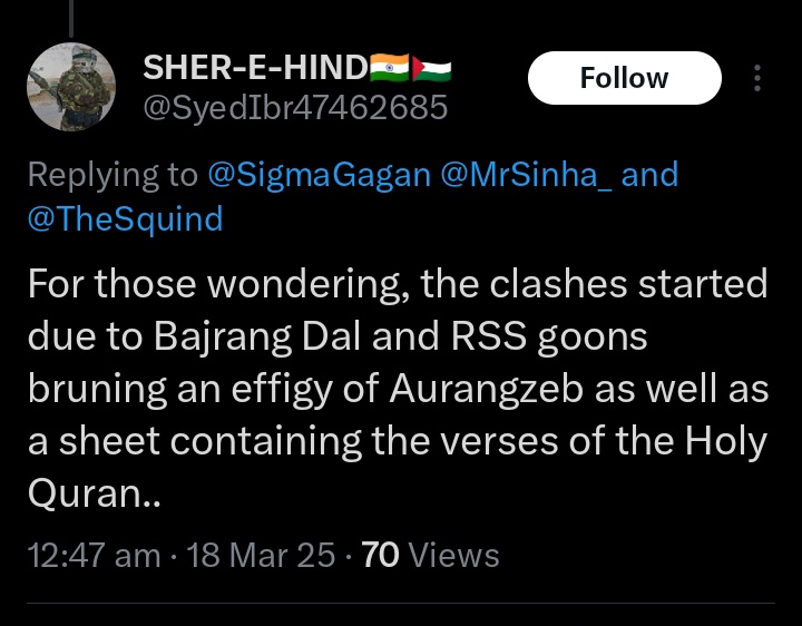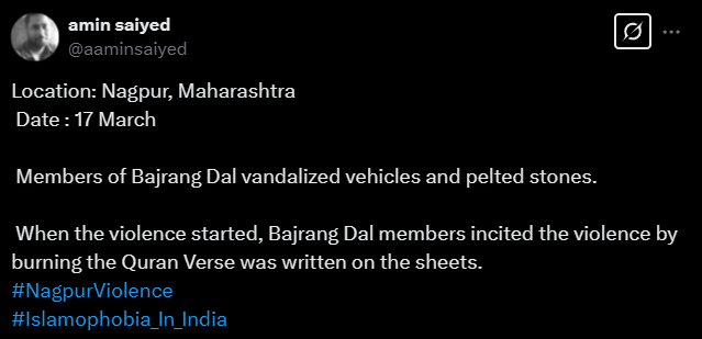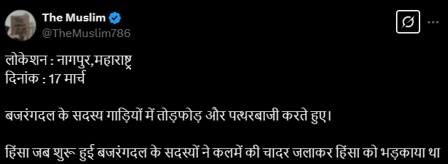 A popular account masquerading as a “Muslim activist” was no different and insisted that the violence was provoked by Bajrang Dal members who burned a chadar displaying Quranic verses.