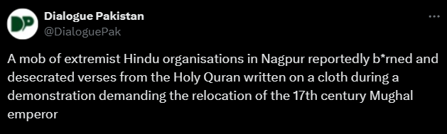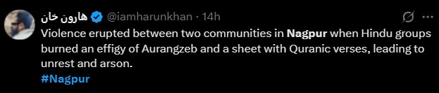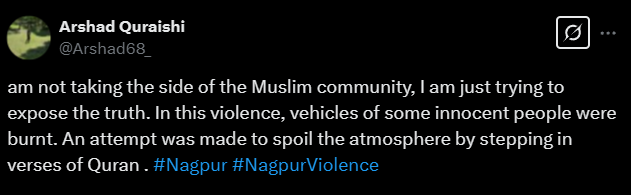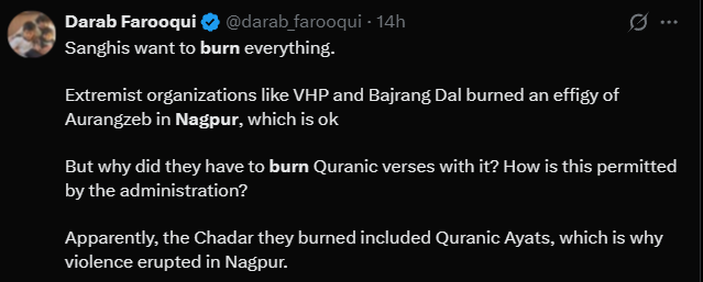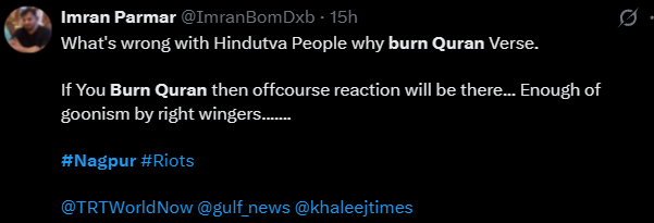 Farooqui then added more disinformation and claimed, “Apparently, the chadar they burned included Quranic ayats which is why violence erupted in Nagpur.” No inquiries or uncertainties concerning the actions of the rioters, only a silent affirmation.