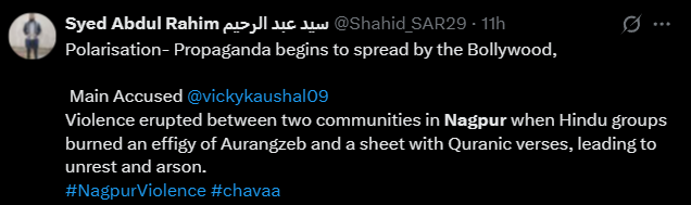 Syed Abdul Rahim echoed the same bogus information and additionally criticized filmmakers for producing “Chhaava” and claimed that its lead actor Vicky Kaushal was the person responsible for the unrest and added, “Propaganda begins to spread by the Bollywood.” Of course, the violent Muslim mob was absolved of any accountability.