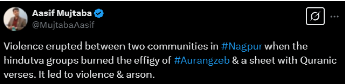 Aasif Mujtaba who claims to be a journalist and an IIT Delhi scholar alleged that it was “violence between two communities” which only transpired after an “effigy of Aurangzeb and a sheet with Quranic verses was burned by Hindutva groups.” However, it is to be expected from a member of the “Shaheen Bagh movement” which resulted in the anti-Hindu violence in Delhi under the pretext of anti-CAA (Citizenship Amendment Act) protests.