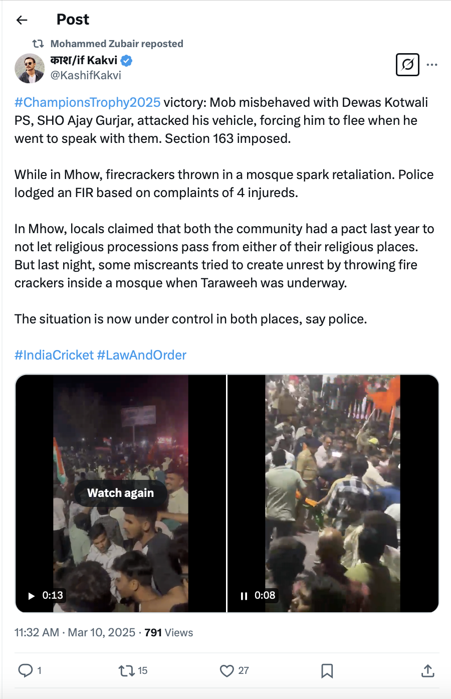 While Mohammad Zubair and other propagandists are attempting to shield the Muslim rioters and blame Hindus for the Mhow violence, the Imam of Jama Masjid has admitted that it was the Muslims who started the violence by attempting to lynch Hindus who were chanting Jai Shri Ram during the cricket victory celebration.