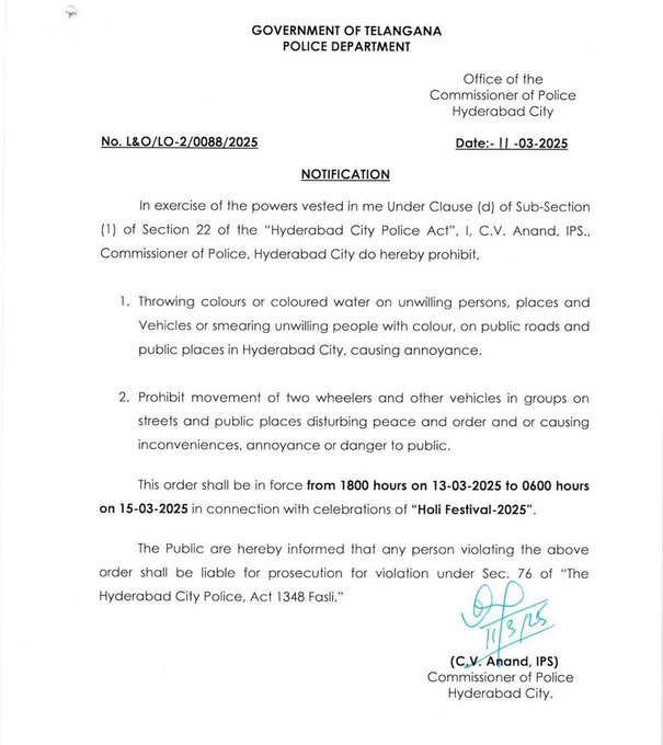 “Throwing colours or coloured water on unwilling persons, places and vehicles or smearing unwilling people with colour, on public roads and public places in Hyderabad City, causing annoyance. Prohibit movement of two-wheelers and other vehicles in groups on streets and public places disturbing peace and order and causing inconveniences, annoyance or danger to public. This order shall be in force from 1800 hours on 13-03-2025 to 0600 hours on 15-03-2025 in connection with celebrations of Holi Festival-2025,” the notice issued on 11th March 2025 reads.