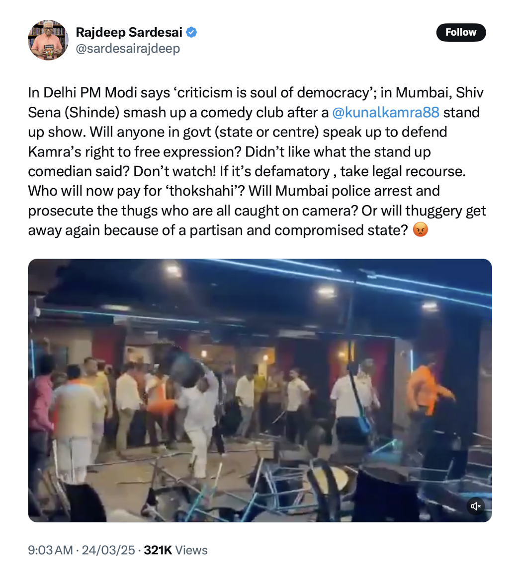 Curiously, Rajdeep didn’t invoke the “Don’t like it, don’t watch it” mantra when hundreds of Muslims in Nagpur orchestrated a violent rampage against Hindu protests over Aurangzeb’s tomb. But when the tables turned—with Shiv Sena workers vandalizing a Mumbai studio after being provoked by Kamra’s “humour”—he suddenly reached for the “right to free expression” argument to condemn the attackers.