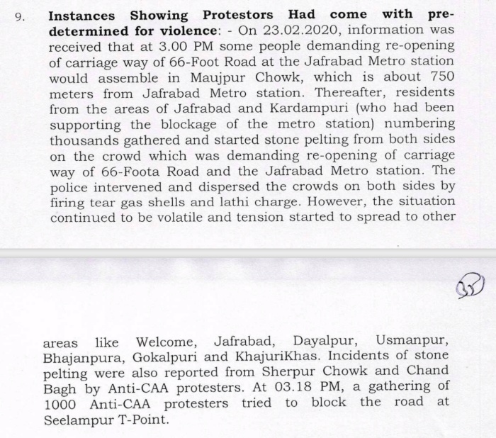 The charge sheet then reveals that the residents of Jafrabad and Kardampuri who were supporting the blockage of the Jafrabad metro station congregated in the thousands and started pelting stones from all quarters at the group that was demanding the re-opening of the roads.