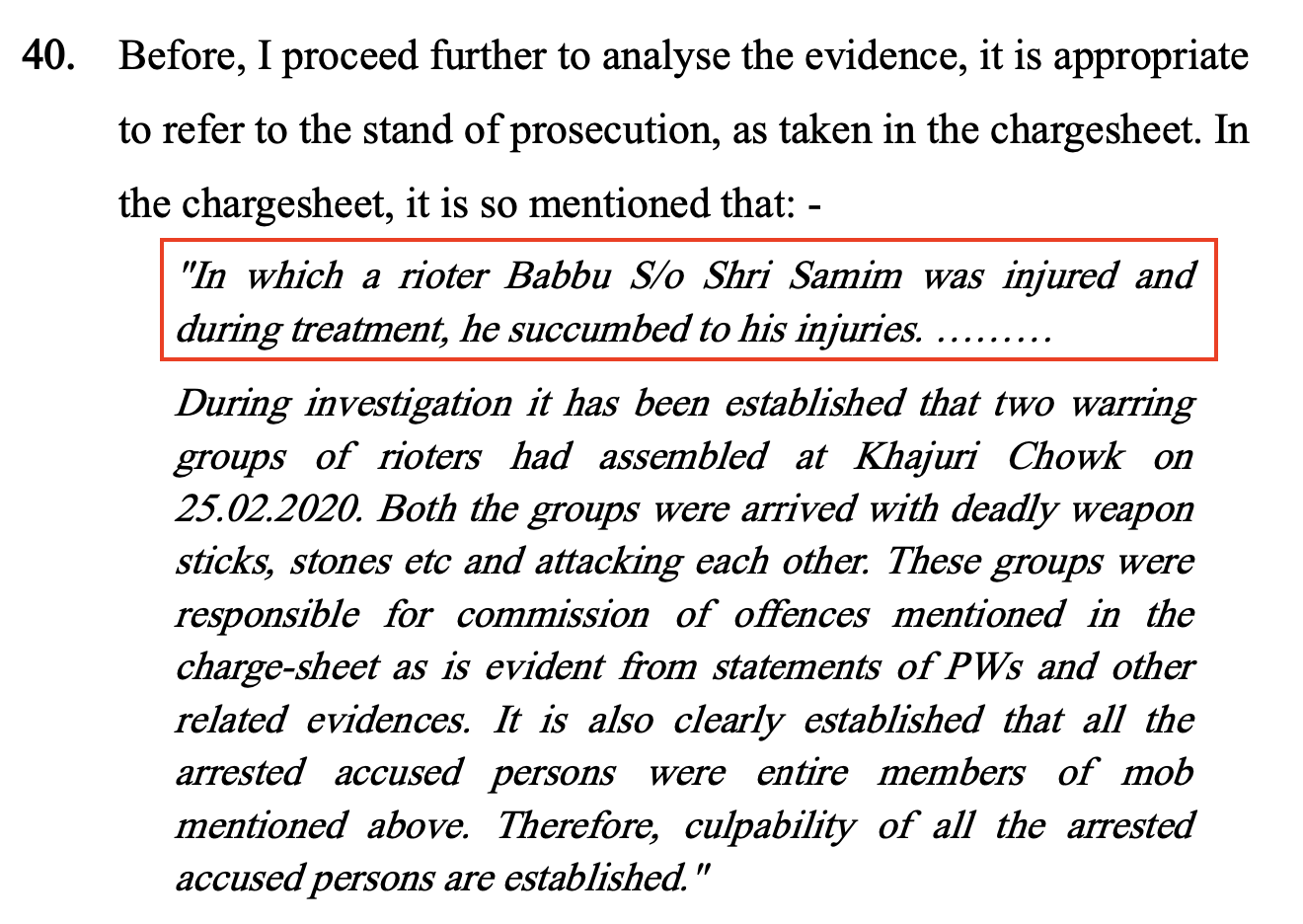 The chargesheet itself refers to a different case being investigated i.e. FIR no. 103/20 by SI Naveen, wherein all these aforesaid accused persons were arrested. FIR 103/20 was also registered in respect of an incident taken place at the same place during same time period, wherein Ct. Amit had sustained fracture in his hand. This example is sufficient to say that for any other riotous activity of aforesaid accused persons, they should have be separately booked. They cannot be prosecuted in this case, which relates to culpable homicide of Babbu. In this case, court has to look for culpability of accused persons, who are connected with incident of beating of Babbu, which resulted into his death.