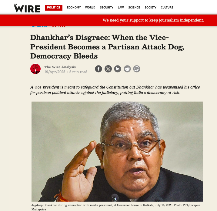 The Wire argued that VP Dhankhar’s criticism contributes towards eroding public trust in the judiciary, and also asserted that he should be ‘sacked’ for his “partisan assaults”.