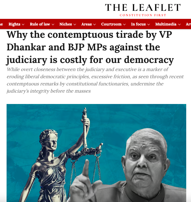 “The most pressing question that props up amidst this unidirectional war of words against the Supreme Court is this: can constitutional officeholders, who are expected to act as neutral guardians of the Constitution, publicly question the provisions of the Constitution and actions of the judiciary in such a brazen and pointed manner?” The Leaflet asked in its piece titled “Why the contemptuous tirade by VP Dhankar and BJP MPs against the judiciary is costly for our democracy”.