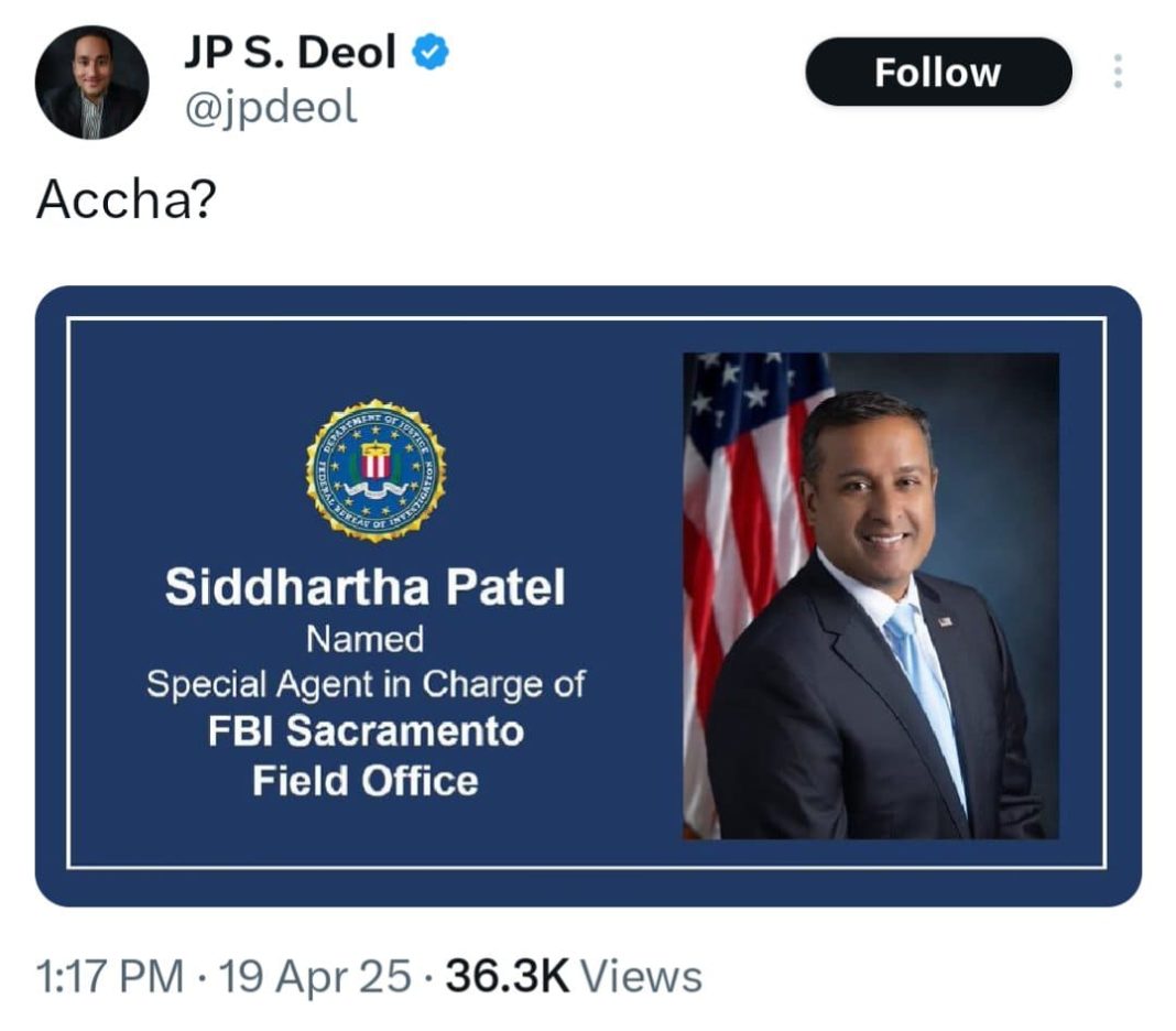 “Accha? (Okay),” he tweeted alongside a picture of Patel. Deol thus shrewdly painted a target on the head of the Indian-origin FBI agent by unleashing pro-Khalistani extremists on his way.