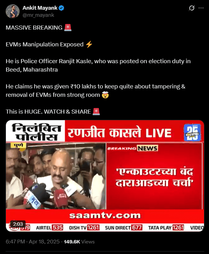 Party troll Ankit Mayank tweeted, “MASSIVE BREAKING…EVMs Manipulation Exposed…He is Police Officer Ranjit Kasle, who was posted on election duty in Beed, Maharashtra. He claims he was given ₹10 lakhs to keep quite about tampering & removal of EVMs from strong room. This is HUGE. WATCH & SHARE”