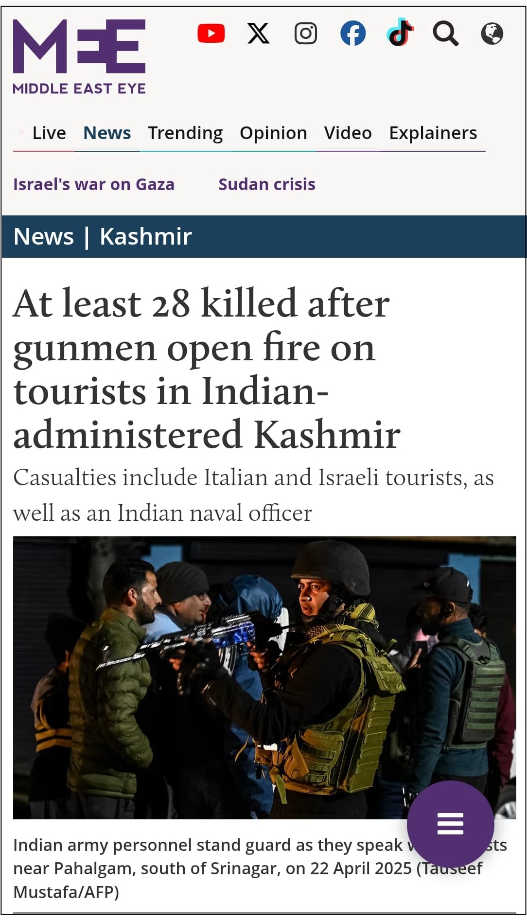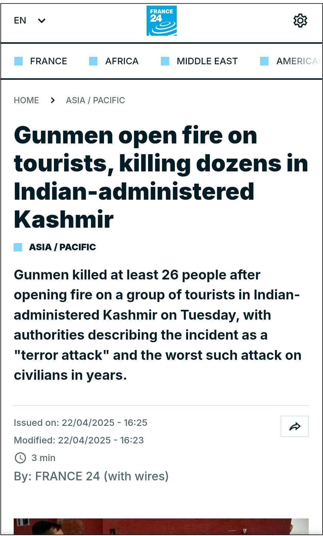 In its report, France 24 called the terrorists “gunmen” and referred to Kashmir as “Indian-administered Kashmir”. Similar to other media houses, France 24 mentioned it as a “terror attack” or “terrorist attack” only while quoting leaders. Archived link of the France 24 report can be checked here.