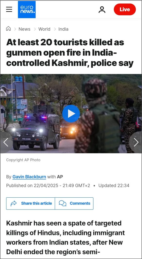 In its report, Euronews also used the phrase “Indian-administered Kashmir” and referred to the terrorists as “gunmen”. Furthermore, the report included the phrase “India-controlled portion of Kashmir”. Archived link of the Euro News report can be checked here.