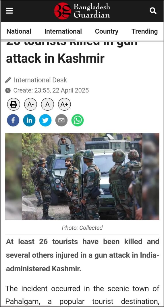 In its report, Bangladesh Guardian referred to the terrorist attack as a “gun attack” and described Kashmir as “Indian-administered Kashmir” in the body of the report. The attackers were referred to as “armed assailants”. Archived link of the Bangladesh Guardian report can be checked here.