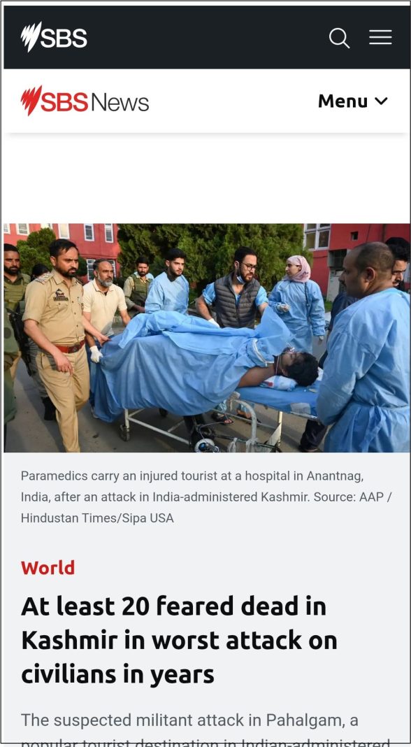 Though SBS did not use the phrase “Indian-administered Kashmir” in the title, it used it in the excerpt and body of the report. The report read, “At least 20 people are feared dead after suspected militants opened fire on tourists in Indian-administered Kashmir on Tuesday.” There was no mention of Islamic terrorists or even “terrorists”; they were referred to as “suspected militants”. Archived link of the SBS News report can be checked here.