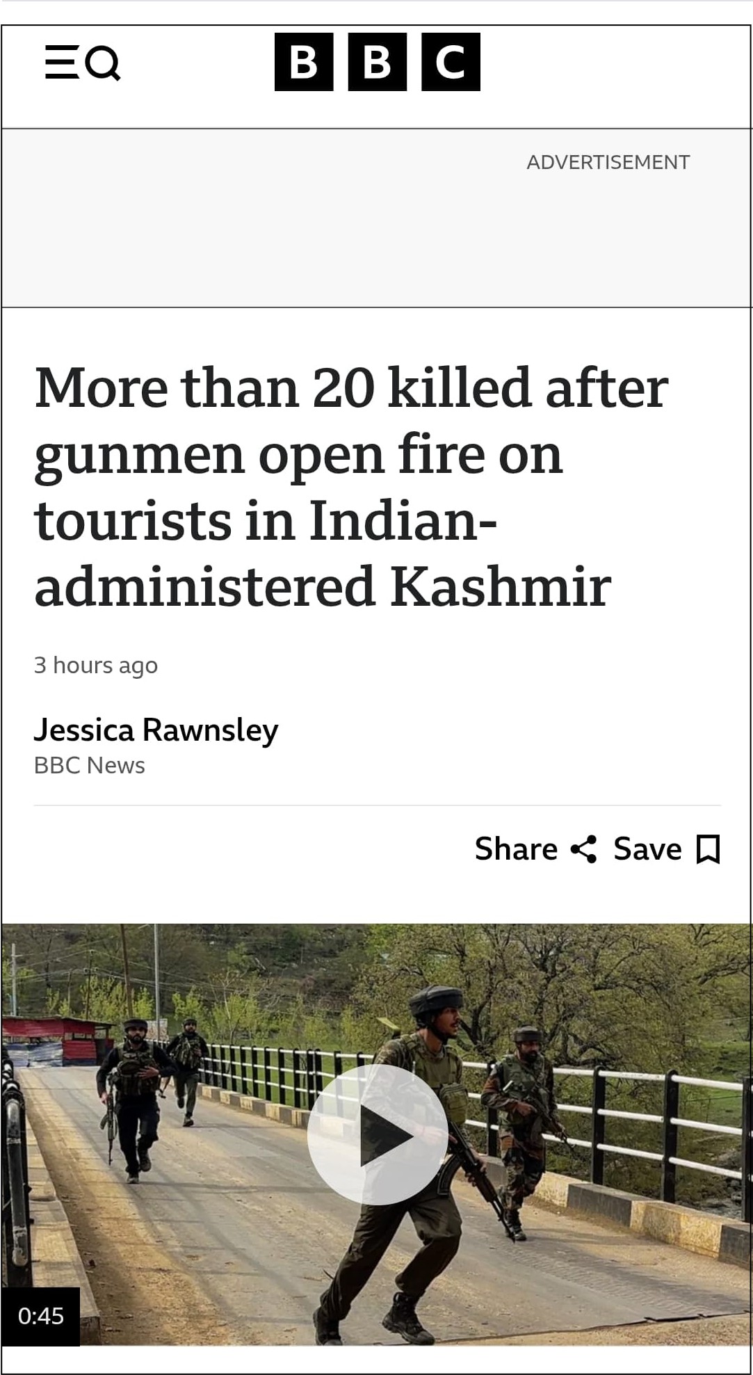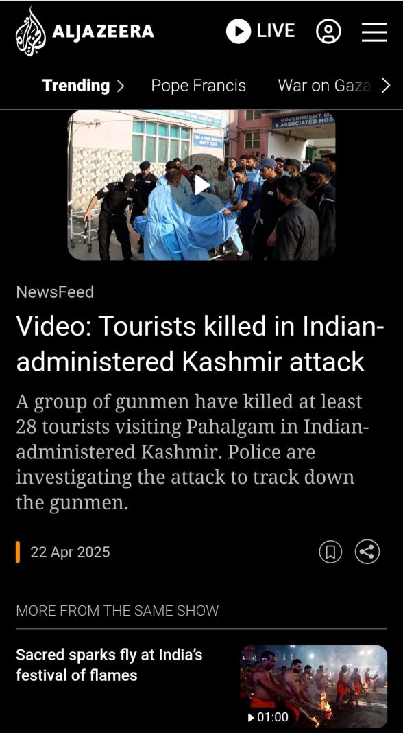 The BBC published the report on the terror attack with the title, “More than 20 killed after gunmen open fire on tourists in Indian-administered Kashmir”. In the report as well, they did not provide any clear indication—other than quoting someone—that it was a terrorist attack. The report read, “At least two dozen people have been killed after gunmen opened fire on a group of domestic tourists visiting a popular beauty spot in Indian-administered Kashmir.” Archived link of the BBC report can be checked here.