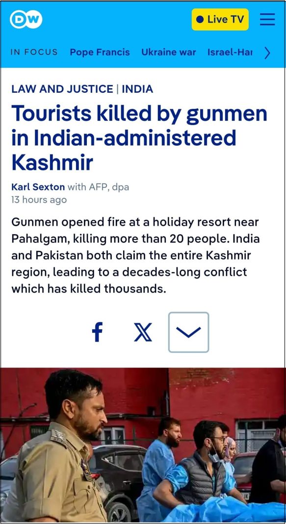 In a report covering the attack, DW referred to the terrorists as “gunmen” and Kashmir as “Indian-administered Kashmir”. DW described Lashkar-e-Taiba as a “militant group” rather than a terrorist outfit. It also failed to label the incident a terror attack or mention “terrorism” outside of quotes from leaders, including Prime Minister Narendra Modi. Archived link of the DW report can be checked here.