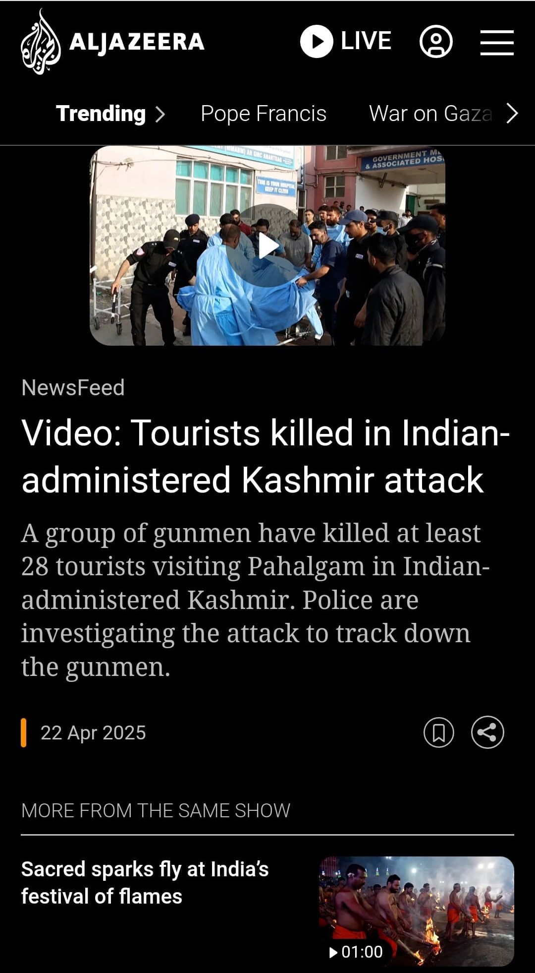 On 22nd April, a deadly attack by Islamic terrorists in Pahalgam in Kashmir left at least 28 dead and several injured. The majority of the dead were Hindus. The terrorists, affiliated with the Resistance Front (TRF), a Lashkar-e-Taiba offshoot, were behind the attack. Victims said on record and on camera that the tourists were killed because they were not Muslims.