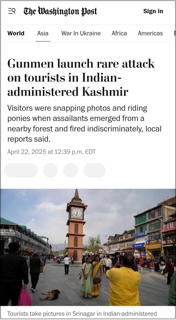 In its report titled “Gunmen launch rare attack on tourists in Indian-administered Kashmir”, The Washington Post not only watered down the fact that it was a terrorist attack, but also challenged the sovereignty of the Indian state by calling Kashmir “India-administered Kashmir”. WaPo also failed to call it a terror attack in the body of the report and mentioned “terrorism” only while quoting Prime Minister Narendra Modi. Archived link of the Washington Post report can be checked here.