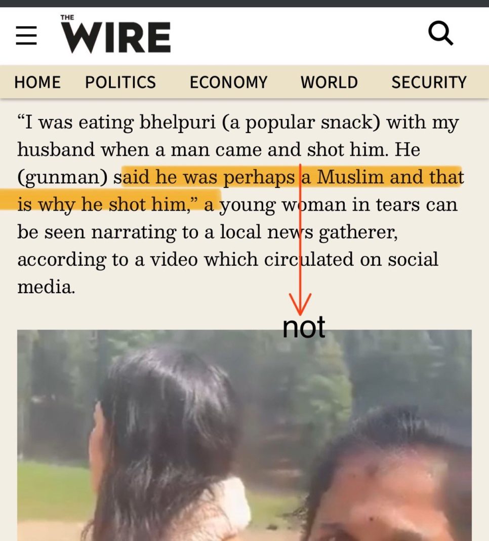 Leftwing propaganda portal The Wire has a history of shielding Islamists. But on April 22, Tuesday, sank to a new low, even by their own diminished standards, when it misquoted an eyewitness testimony that established the religious motive behind the Pahalgam terror attack.