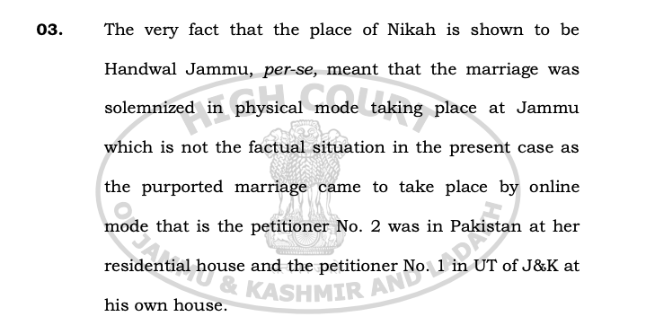 “The very fact that the place of Nikah is shown to be Handwal Jammu, per-se, meant that the marriage was solemnized in physical mode taking place at Jammu which is not the factual situation in the present case as the purported marriage came to take place by online mode that is the petitioner No. 2 was in Pakistan at her residential house and the petitioner No. 1 in UT of J&K at his own house,” the court noted.