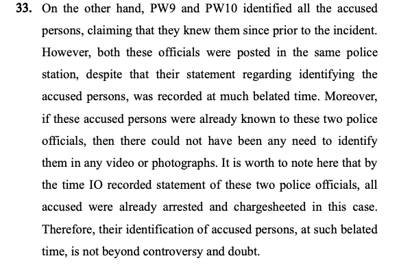 The court, however, noted that “both these officials were posted in the same police station, despite that their statement regarding identifying the accused persons, was recorded at much belated time.”