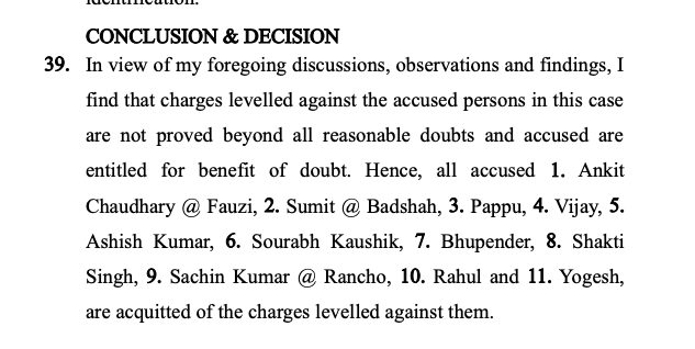 “In view of my foregoing discussions, observations and findings, I find that charges levelled against the accused persons in this case are not proved beyond all reasonable doubts and accused are entitled for benefit of doubt. Hence, all accused 1. Ankit Chaudhary @ Fauzi, 2. Sumit @ Badshah, 3. Pappu, 4. Vijay, 5. Ashish Kumar, 6. Sourabh Kaushik, 7. Bhupender, 8. Shakti Singh, 9. Sachin Kumar @ Rancho, 10. Rahul and 11. Yogesh, are acquitted of the charges levelled against them,” the judge stated.