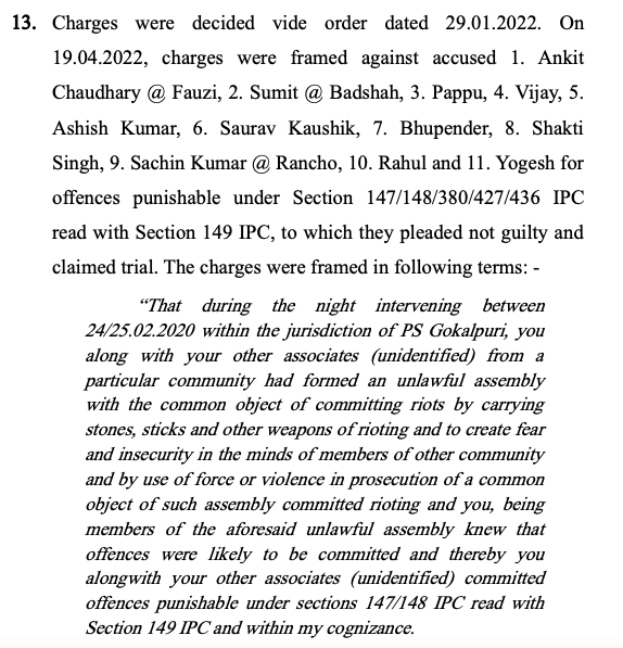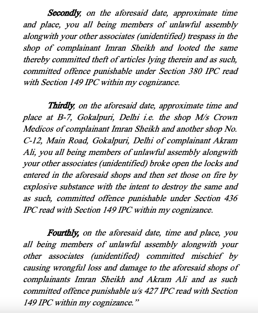 Ankit Chaudhary alias Fauji, Sumit alias Badshah, Pappu, Vijay, Ashish Kumar, Sourabh Kaushik, Bhupender, Shakti Singh, Sachin Kumar alias Rancho, Rahul and Yogesh, were chargesheeted by the Delhi Police for offences under 147/148/149/ 380/427/436 IPC on 3rd May 2020.