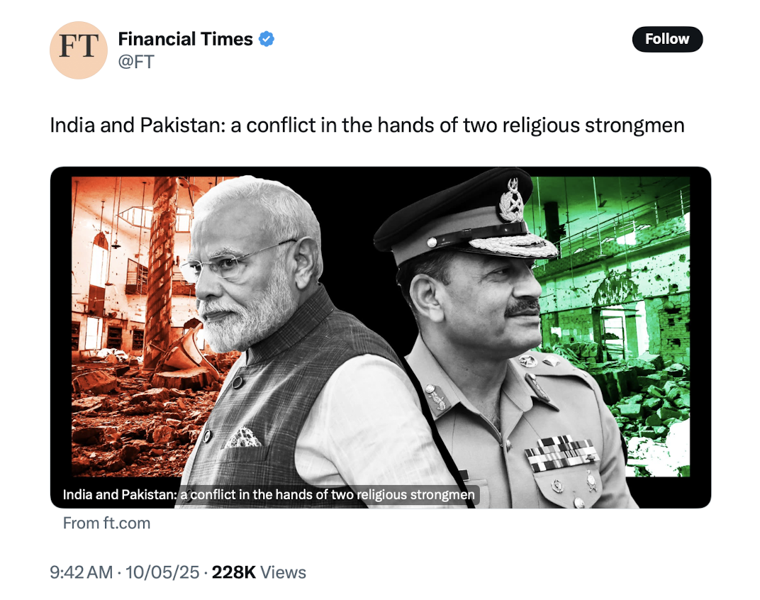 By calling both leaders “devoutly religious strongmen,” the FT conveniently erases the power asymmetry: one side is a democracy constrained by public accountability and law; the other is a military dictatorship that bankrolls and deploys jihadist proxies.