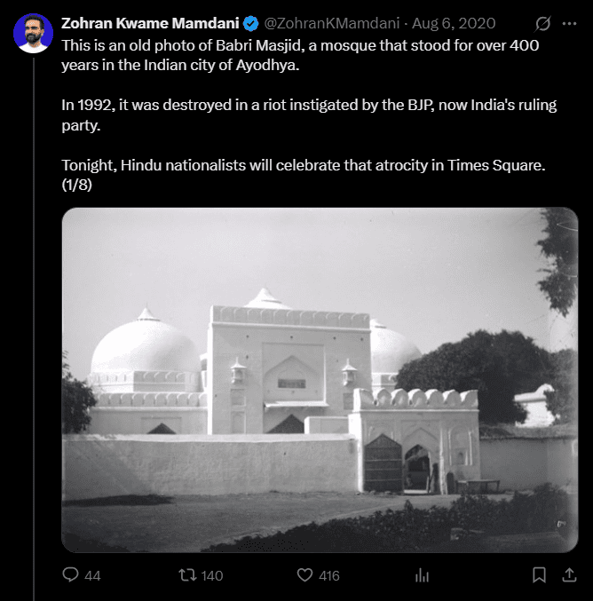 Around the same time, Zohran Mamdani peddled vicious disinformation on X (formerly Twitter) about the re-constrcution of Ram Mandir. For context, a Ram Mandir always existed at the very site in Ayodhya since time immemorial.