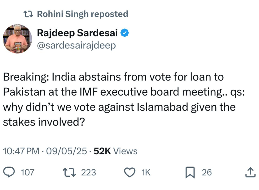 Journalist Rajdeep Sardesai also furthered the misinformation about the Indian government by questioning why India did not vote against Pakistan’s loan request at the IMF. “India abstains from vote for loan to Pakistan at the IMF executive board meeting..qs: why didn’t we vote against Islamabad given the stakes involved?” Sardesai posted on X on Friday.