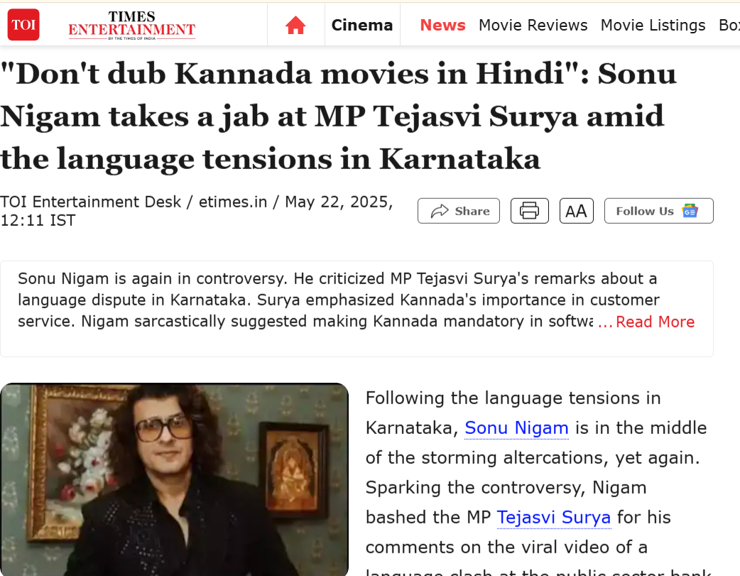 The news reports shared a tweet saying, “Don’t dub Kannada movies in Hindi! Don’t release Kannada movies pan-India! Do you have the guts to say this to Kannada film stars, Mr. @Tejasvi_Surya, or you are just another language warrior?” Notably, Sonu Nigam is already embroiled in controversy over his remarks at a concert after a fan asked him to sing in Kannada.