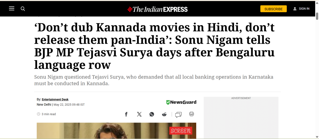 In a ridiculous act, several prominent mainstream media outlets ended up spreading fake news after they attributed remarks made by a different person to singer Sonu Nigam. The media outlets, including India Today, the Times of India, and the Indian Express, claimed that singer Sonu Nigam has said that Kannada movies should not be dubbed into Hindi, and Kannada movies should not be released all over India.