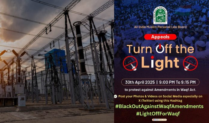 ऑल इंडिया मुस्लिम पर्सनल लॉ बोर्ड तमाम देशवासियों से अपील करता है कि वो वक़्फ़ संशोधन विधेयक 2025 के खिलाफ आज 30 अप्रैल की रात 9 बजे से 9:15 बजे तक अपने घरों, दुकानों, फ़ैक्टरियों और दूसरे कारोबारी स्थानों की बत्तियाँ बुझा (लाइट ऑफ़) करके एक शांतिपूर्ण और खामोश ‘बत्ती गुल तहरीक’… pic.twitter.com/6CABayIyW6