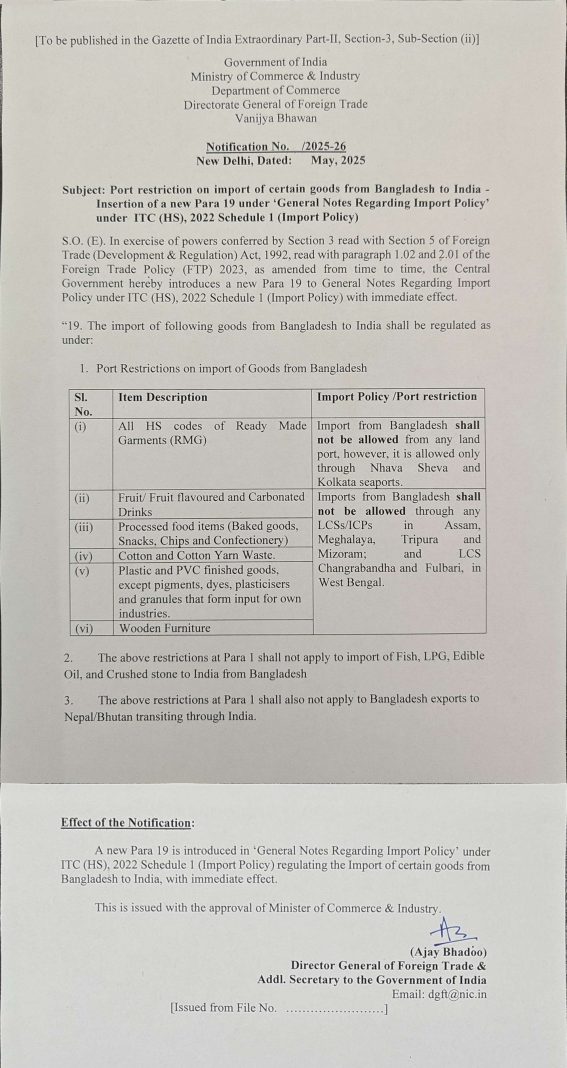 A month after the Indian Government withdrew the transshipment facility extended to Bangladesh, now port restrictions have been imposed on import of certain goods from the country. The Directorate General of Foreign Trade under Department of Commerce of the Ministry of Commerce & Industry issued a notification on 17th May imposing port restrictions on the import of certain goods such as Readymade garments, processed food items etc, from Bangladesh to India.