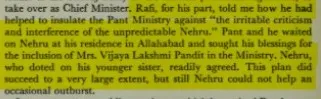 Durga Das, journalist and founding president of the Press Club of India (PCI), writes in his book “India From Curzon to Nehru and After” that it was Govind Ballabh Pant and Rafi Ahmed Kidwai who approached Nehru with the recommendation to appoint Vijaya Lakshmi Pandit as a minister. The real intention behind this was, “If we appoint a member of Nehru’s family as a minister, we will earn Nehru’s blessings, and he will not trouble us without reason.”