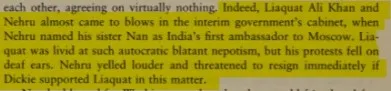 The book says that when the country became independent, an interim government was formed under Nehru’s leadership. Nehru was the Prime Minister of this government, Liaquat Ali Khan was the Finance Minister, and Lord Mountbatten was the Governor-General. Nehru proposed to appoint his sister, Vijaya Lakshmi Pandit, as India’s first ambassador to the Soviet Union. Liaquat Ali Khan strongly opposed the move, calling it an act of brazen dynasticism.