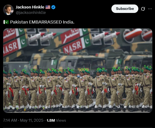 - “India was so shocked by Pakistan’s military capabilities, they begged Trump for a ceasefire last night.Don’t start a war you can’t win…”
