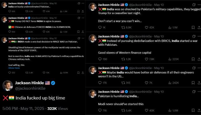 OpIndia analysed the social media activity of Jackson Hinkle and found a drastic spike in X posts, which falsely claim ‘Pakistani victory over India’ in the aftermath of Operation Sindoor.