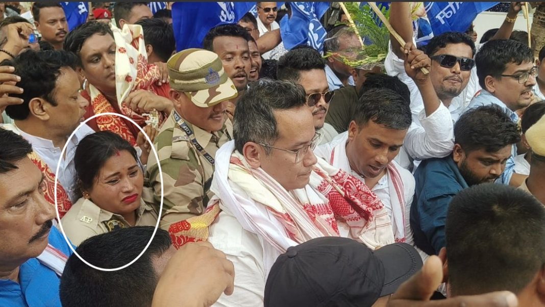 In one of the photos, a female Assam Police personnel standing behind Gaurav Gogoi can be seen with a very uncomfortable expression on her face, as she is being pushed from behind by Congress workers.