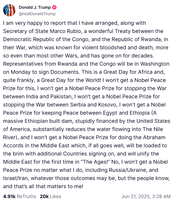However, Trump decided to claim full credit and stated, “Representatives from Rwanda and the Congo will be in Washington on Monday to sign Documents,” before veering off into a litany of grievances about not receiving the Nobel Peace Prize. While reports suggest that two nations would sign a treaty on 27th June in Washington, giving full credit to Trump would not be wise.