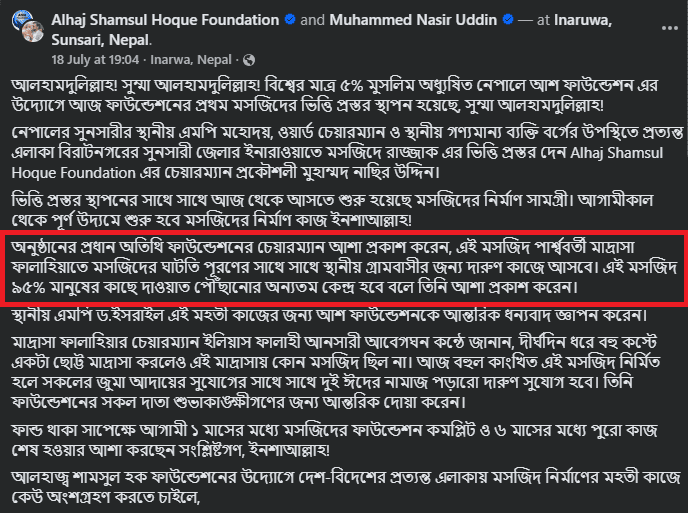 “There are only 5% Muslims in Nepal. There is an opportunity of Daʿwah (Islamic proselytism),” he declared in a viral video posted on Facebook on Friday (25th July).