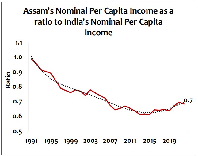 Capital expenditure has more than doubled, from ₹12,000 Cr in 2020-21 to ₹26,000 Cr in 2024-25. It is interesting to note that the State’s nominal per capita income as a ratio of India’s nominal per capita income had declined steadily over the years, until 2014 – post which the ratio has increased slowly.