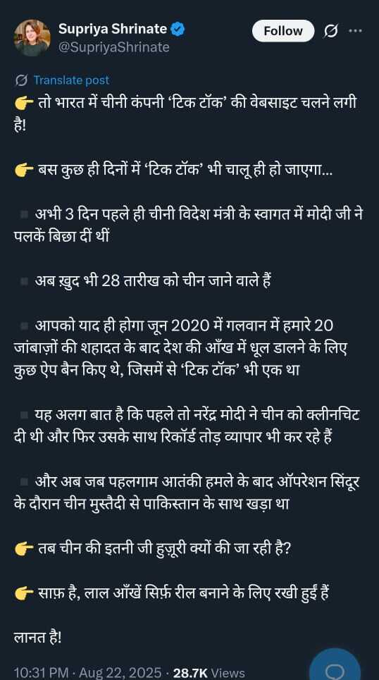 The Congress Party grabbed the opportunity to slam the Modi government. Former journalist and Congress leader, Supriya Shrinate, lashed out at the Modi government, claiming that the government deceived people by banning the Chinese app after the Galwan Valley clash. She added that soon the app will be running in India.