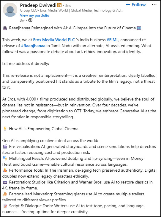 There were no meetings, no warnings, no conversations, only the fait accompli of seeing his work rewritten by a machine. Such exclusions speak to a widening gulf between the corporate entities that own films and the humans who gave them life. However, Group CEO of Eros Media World, Pradeep Dwivedi claimed that it is not a “replacement” but a “reinterpretation”.