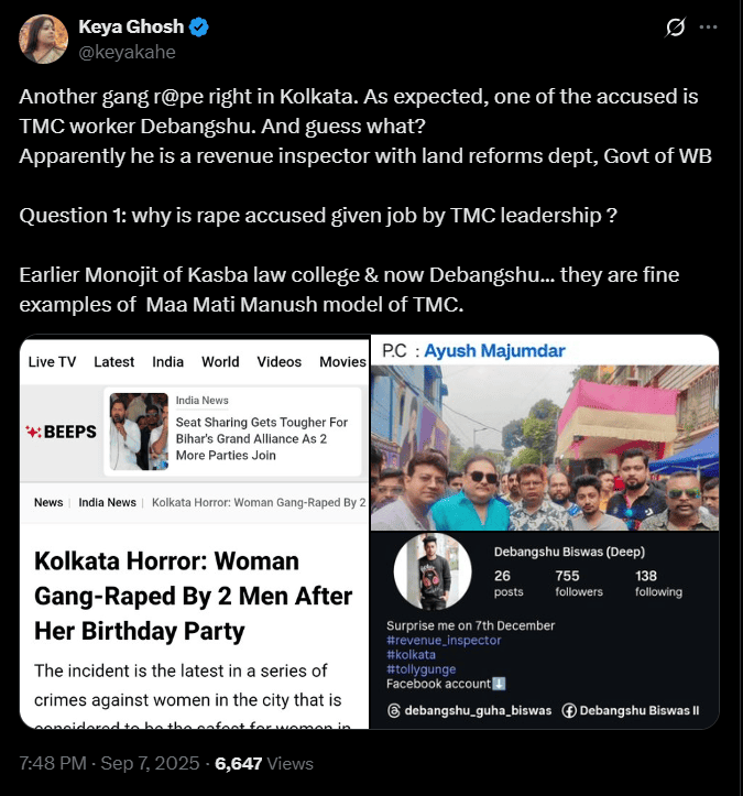 On Friday (5th September), a young woman was raped by a Trinamool Congress (TMC) worker and his aide in the Haridevpur area of Kolkata.