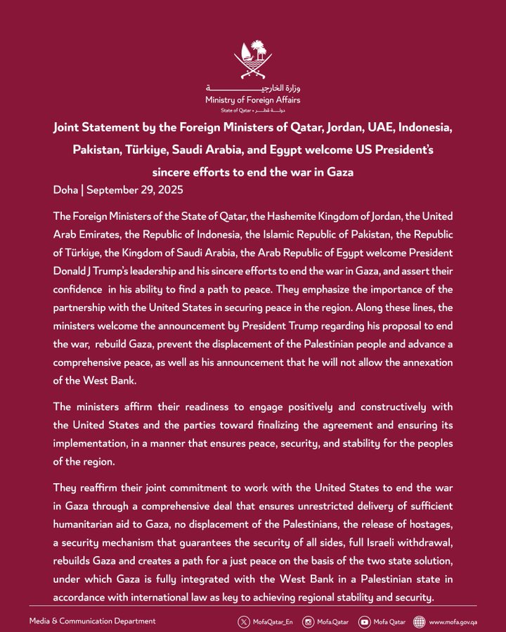 Despite there not being much hope for Hamas to agree to the Trump Gaza Peace Plan, the foreign ministers of Islamic countries, Qatar, Jordan, UAE, Indonesia, Pakistan, Turkey, Saudi Arabia, and Egypt have issued a joint statement welcoming the proposal. They also lauded Trump’s commitment to block any Israeli annexation of the West Bank. In their statement, the ministers affirmed their “readiness to engage positively and constructively” with the United States and other parties to finalise and implement the agreement.