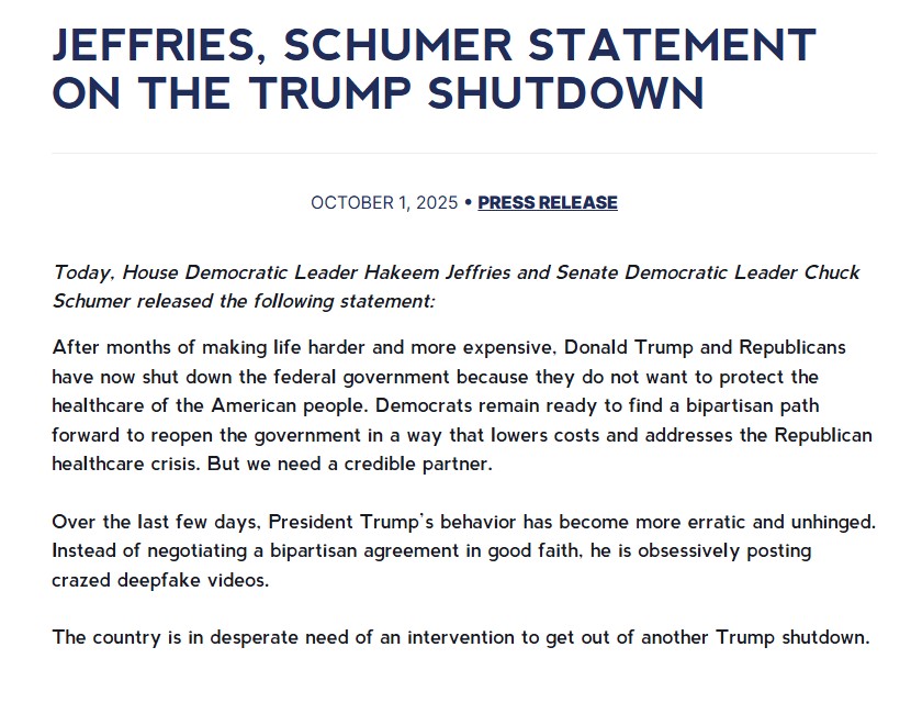 “After months of making life harder and more expensive, Donald Trump and Republicans have now shut down the federal government because they do not want to protect the healthcare of the American people,” the Democratic leaders said in a joint statement.