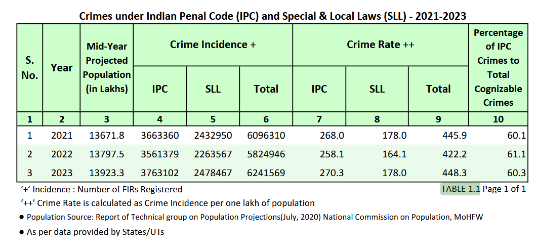 In 2023, a total of 62,41,569 offences were reported. Out of these, 37,63,102 were registered under the IPC and 24,78,467 under SLL. IPC crimes accounted for 60.3% of all offences. The report recorded a 5.7% growth in IPC crimes and a 9.5% rise in SLL crimes compared to 2022. While the crime rate per lakh of population was 422.2 in 2022, it increased to 448.3 in 2023.